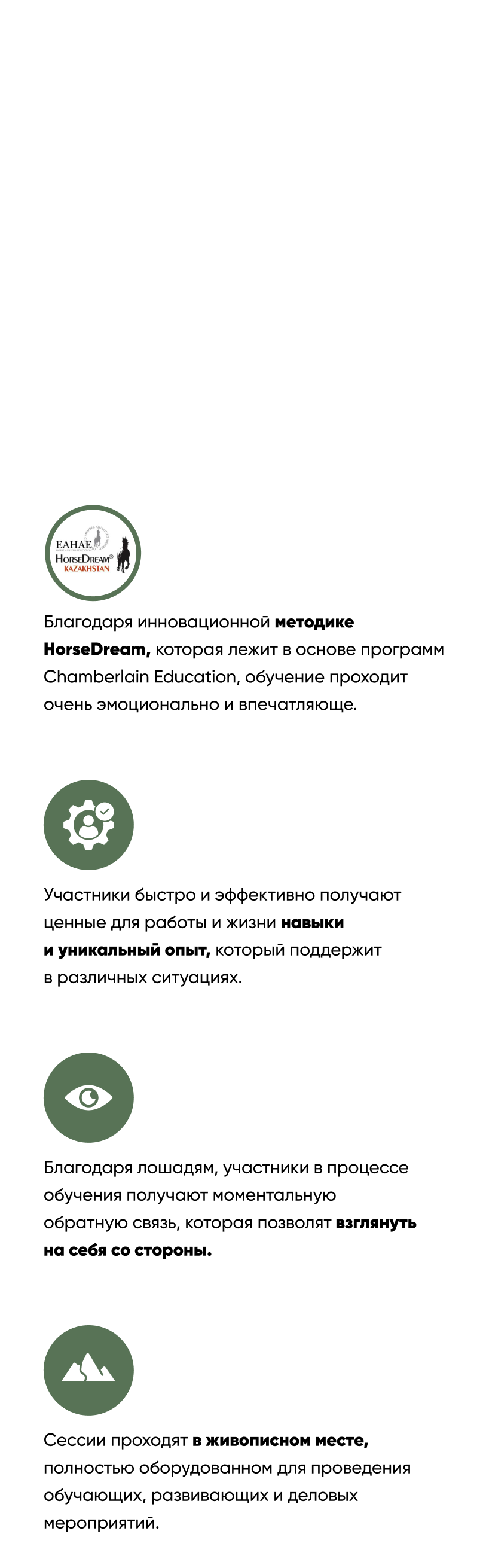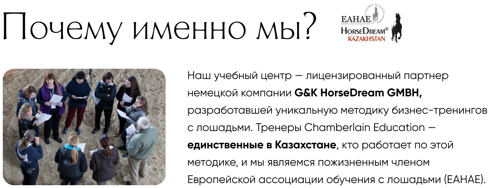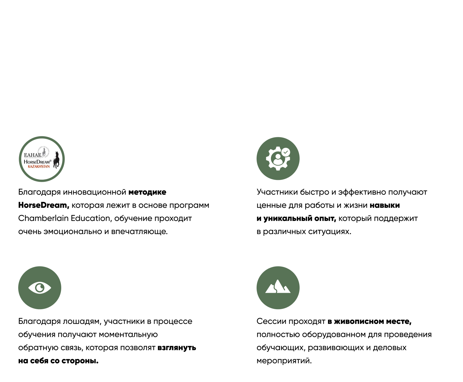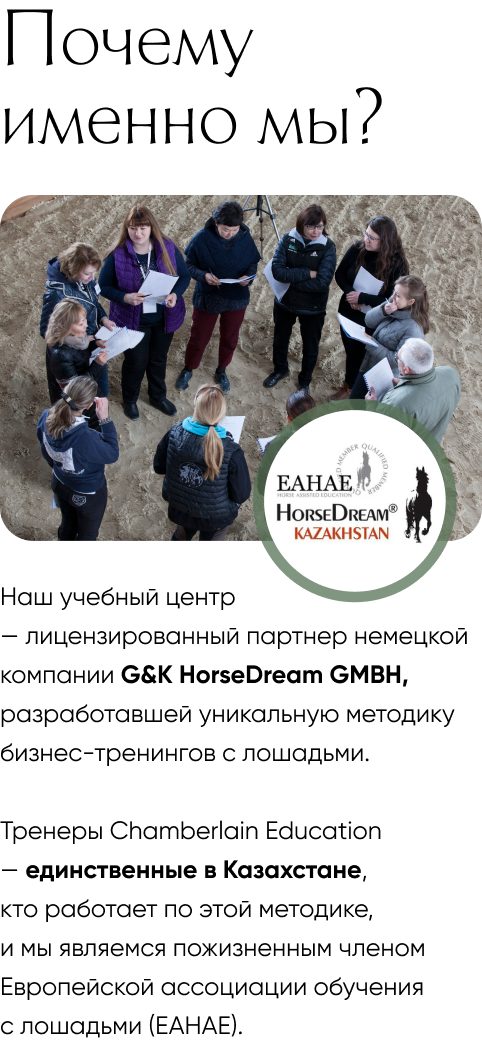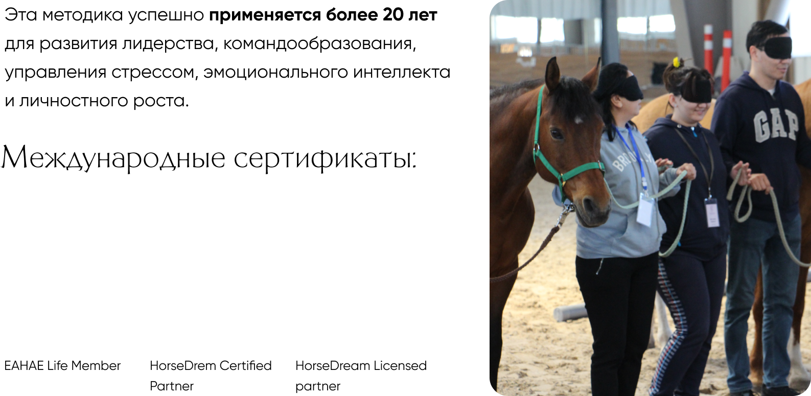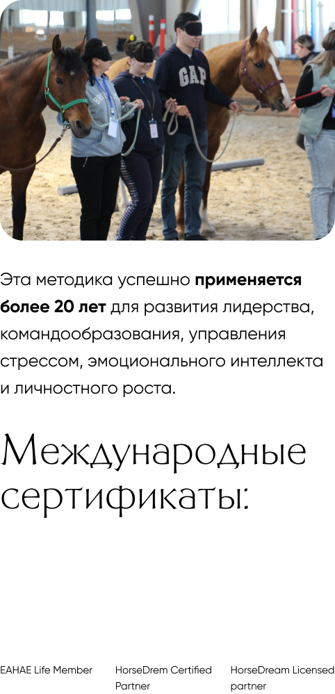 Программа направлена на работу с эмоциональным выгоранием, создание доверия и открытого общения между участниками. Взаимодействуя с лошадьми по методике HorseDream, участники получают возможность снять маски, открыться и увидеть коллег с новой стороны.